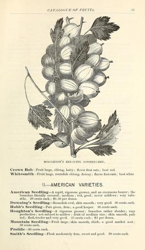 | Keywords: Descriptive catalogue of fruits (15821662094).jpg CATALOGUE OF FRUIT <br> 53 <br> HOUGHTON S SEEDLING GOOSEBKRRY <br> CrOWll Bob Fruit large oblong hairy; flavor first rate ; best red <br> Whitesmith Fruit large roundish oblong downy; flavor first rate ; best white <br> II AMERICAN VARIETIES <br> American Seedling A rapid vigorous grower and an enormous bearer ; the <br> branches literally covered ; medium ; red good ; never mildews ; very valu- <br> able 20 cents each ; 1 50 per dozen <br> Downing's Seedling Koundish oval skin smooth ; very good 30 cents each <br> Hobb's Seedling Pale green firm ; a good keeper 30 cents each <br> Houghton's Seedling A vigorous grower; branches rather slender; very <br> productive ; not subject to mildew ; fruit of medium size ; skin smooth pale <br> red ; flesh tender and very good 25 cents each ; 2 per dozen <br> Mountain Seedling Fruit large skin smooth thick; a good market sort; <br> 30 cents each <br> Prolific 30 cents each <br> Smith's Seedling Flesh moderately firm sweet and good 30 cents each 42753062 136550 68459 Page 53 Text http //www biodiversitylibrary org/page/42753062 1876 10 5962/bhl title 68459 Ellwanger Barry ; Ellwanger Barry ; Henry G Gilbert Nursery and Seed Trade Catalog Collection ; Mount Hope Nurseries Biodiversity Heritage Library Descriptive catalogue of fruits Garden Stories Catalogs Fruit Nursery stock Plants Seeds U S Department of Agriculture National Agricultural Library bhl page 42753062 dc identifier http //biodiversitylibrary org/page/42753062 Ellwanger Barry's bhlGardenStories Gooseberry BHLinbloom u s department of agriculture national agricultural library ellwanger barry's bhlgardenstories bhlinbloom Information field Flickr posted date ISOdate 2015-02-04 CC-BY-2 0 BioDivLibrary https //flickr com/photos/61021753 N02/15821662094 2015-08-24 04 50 17 cc-by-2 0 PD-old-70-1923 Descriptive catalogue of fruits Photos uploaded from Flickr by FĂŚ using a script |