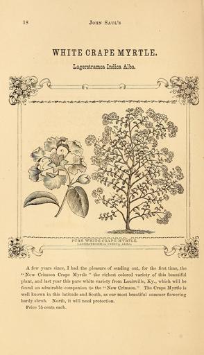 Keywords: Descriptive catalogue of new, rare and beautiful plants, dahlias, chrysanthemums, geraniums, fuchsias, carnations, verbenas, phloxes, &c. for spring, 1873, cultivated and for sale by John Saul, (16249902440).jpg 18 <br> John Saul's <br> WHITE CRAPE MYRTLE <br> Lagerstramca Indica Alba <br> PURR WHITE CRAPE MYRTLE <br> LAGERSTROKMIA IXDICA ALBA <br> A few years since I had the pleasure of sending out for the first time the <br> New Crimson Crape Myrtle the richest colored variety of this beautiful <br> plant and last year this pure white variety from Louisville Ky which will be <br> found an admirable companion to the New Crimson The Crape Myrtle is <br> well known in this latitude and South as our most beautiful summer flowering <br> hard ' shrub North it will need protection <br> Price 75 cents each 42482180 134502 67109 Page 18 Text http //www biodiversitylibrary org/page/42482180 1873 10 5962/bhl title 67109 Henry G Gilbert Nursery and Seed Trade Catalog Collection ; John Saul Firm Washington D C NameFound Indica NameConfirmed Indica NameBankID 4432528 Biodiversity Heritage Library Descriptive catalogue of new rare and beautiful plants dahlias chrysanthemums geraniums fuchsias carnations verbenas phloxes c for spring 1873 cultivated and for sale by John Saul nurseryman seed grower and importer Garden Stories Catalogs Flowers Nurseries Horticulture Plants Seeds U S Department of Agriculture National Agricultural Library bhl page 42482180 dc identifier http //biodiversitylibrary org/page/42482180 White crape myrtle Lagerstromia indica alba bhlGardenStories BHLinbloom nurseries horticulture u s department of agriculture national agricultural library bhlgardenstories bhlinbloom Information field Flickr posted date ISOdate 2015-02-03 CC-BY-2 0 BioDivLibrary https //flickr com/photos/61021753 N02/16249902440 2015-08-25 01 53 23 cc-by-2 0 PD-old-70-1923 Descriptive catalogue of new rare and beautiful plants Photos uploaded from Flickr by Fæ using a script |