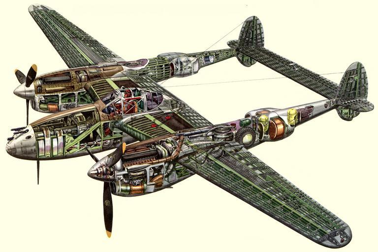 The P-38, first conceived in 1937, has evolved through 16 major modifications to the P-38J, latest of the series to actually be delivered, although others are in process of engineering, experimental work or testing. Basically, it is an all-metal, midwing, twin-engined single seater having twin boom nacelles and fuselage of semi-monocoque, stressed skin type.