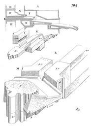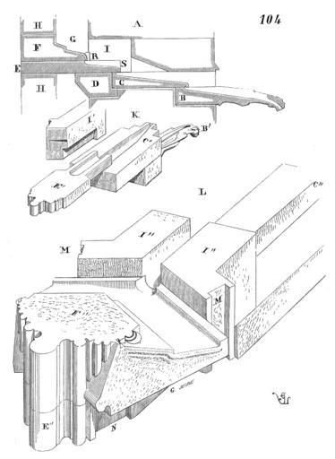 Keywords: Detail.contre.fort.abside.Saint.Urbain.Troyes.png Prenons donc d'abord toute la partie du contre-fort comprise entre H et O c'est-à-dire le plafond de la galerie et son linteau reliant la pile intérieure au contre-fort l'enchâssement de claires-voies et l'écoulement des eaux sur ce point En A 104 on voit la coupe prise dans l'axe du contre-fort et de la pile B est la gargouille rejetant à l'extérieur les eaux recueillies sur le passage G c'est-à-dire non-seulement la pluie tombant verticalement sur ce dallage ce qui est peu de chose mais celle fouettant contre les vitraux Plans et relevés de la basilique Saint-Urbain de Troyes Buttresses in France Drawings of buttresses |