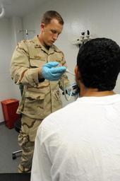 Keywords: Detainee Medical Care DVIDS298591.jpg en Navy Petty Officer 3rd Class Nicholas Fouch hospital corpsman with Joint Task Force Guantanamo ™s Joint Medical Group takes a detainee ™s vital signs July 9 2010 The JMG provides medical care to the detainees at JTF Guantanamo 2010-07-09 Petty Officer 3rd Class Joshua Nistas https //www dvidshub net/image/298591 100709-N-+++++-046 2010-07-13 15 22 GUANTANAMO BAY CU PD-USGov-Military-Navy Joint Task Force Guantanamo Guantanamo Bay Images from DoD uploaded by Fæ |