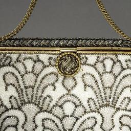 Keywords: Detalj, Aftonväska, Jolles original - Livrustkammaren - 67950.tif Aftonväska som är helt täckt med ett pärlbroderi Glaspärlorna diam 1 mm bildar ett liljemönster i färgerna benvitt ljust och mörkt nougat samt bärnstensfärg <br/>Väskans öppning av gulmetall har en hävstångstryckknapp diam 21 mm Den är kantad med gulmetall och har en inre del av små pärlor Knappen fodrad med ljust sämskskinn <br/><br/>Väskan bärs i kedja av små länkar av gulmetall <br/>Väskans foder av benvitt siden har två sidofack <br/>I ett fack ligger en spegel längd 88 mm höjd 58 mm <br/>I ett av väskan övre hörn sitter en etikett med tillverkarens namn <br/> Jolles // ORGINAL // MADE IN AUSTRIA original caption Detalj Aftonväska Jolles original LRK 11956<br/> Nyckelord Aftonväska Detalj Sibylla Pärlor Glaspärlor Den oumbärliga väskan Jolles Föremålsbild decade other date - 1930 1940 pearls Färg glas bärnsten material pärlor - brass - silk Färg vit material siden g 367 size mm 205 153 LRK Sibylla hertiginna av Västerbotten Prinsessor Den oumbärliga väskan 2008-2009 Jolles original Made in Austria Jolles Jolles original Made in Austria Jolles place of origin original filename lm_dig6130 48568 inventory number LRK 11956 67950 CC-BY-SA Göran Schmidt Göran Schmidt Princess Sibylla of Saxe-Coburg and Gotha Bags Handbags Media contributed by LSH unmatched keyword Color images from Livrustkammaren Media contributed by LSH 2013-10 |