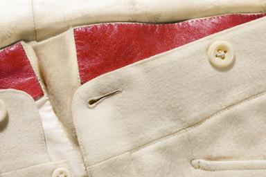 Keywords: Detalj av kostym. Foto till boken: Ett sekel av dräkt och mode ur de Hallwylska samlingarna - Hallwylska museet - 89347.tif KOSTYM kavaj- <br/><br/>Bestående av kavaj väst och byxor <br/><br/>Av vit cheviot samt med gulvita benknappar Hand- och maskinsydda <br/><br/>Kavaj Enradig livskuren med fyra knappar samt nedviken krage och korta slag i det vänstra ett knapphål; framstyckenas hörn rundade Ryggen med sid- och axelsömmar Knapparna runda fyrhåliga med plan framsida och stavformig kant Foder av smalrandigt vitt siden alpacka på högra framstycket en bröstficka; ärmfoder av smalrandigt crèmegult halvsiden <br/><br/>Mått Ärmhålsdjup 23 cm ; längd hel 76 cm ; ryggbredd halv 19 cm ; ärmlängd 80 cm ; bröstvidd fram 44 cm ; bröstvidd hel 106 cm ; livvidd 98 cm <br/><br/>Väst Enradig med sex knappar som de mindre i kavajen korta vinkelskurna slag samt två svagt snedskurna sidofickor samt på vänstra framstycket dessutom en dylik bröstficka alla med rak kantslå Ryggstycke av vit ylleklot ett stycke från nedre kanten två spänntampar med spänne av svartlackerad mässing och med två taggar tornar Nedtill i mitten ett sprund Fodret i rygg- och framstycken av blommig vit bomullssatin <br/><br/>Mått Schalöppning 31 cm Hel västlängd 70 cm <br/><br/>Byxor Upptill på vardera framstycket en snedskuren tvärficka Midjeband med hake och hyska knapp och knapphål samt sex hängselknappar Gylfen med fyra små knappar ock knapphål Midjebandet fodrat med rött skinn saffian bak- och gylffoder av vitt bomullstyg Fickor av vitt bomullstyg Knapphålen handsydda med vitt grovt silke eller vit bomullstråd <br/><br/>Mått Yttersöm längd 106 cm ; innersöm längd 82 cm ; livvidd 82 cm ; stussvidd 108 cm ; lårvidd 66 cm ; knävidd 48 cm ; vidd nedtill 46 cm <br/><br/>Förfärdigade efter beställning av Walther von Hallwyl i Oktober 1900 hos skrädderifirman Fr Kaedings Efterträdare Zittorin Lundvik hovleverantörer <br/><br/>Begagnad av Walther von Hallwyl under hans resa genom Egypten och Sudan tillsammans med sin maka dotter och svärson samt fröken Ida Uhse den 5 November 1900 till 29 Mars 1901 original caption Detalj av kostym Foto till boken Ett sekel av dräkt och mode ur de Hallwylska samlingarna <br/> Nyckelord Detalj Herrmode Föremålsbild Ett sekel av dräkt och mode ur de Hallwylska samlingarna HWY Walther von Hallwyl place of origin Stockholm SE original filename hm_dig3420 8246 inventory number HWY XXI I A 03 89347 CC-BY-SA Jens Mohr <gallery caption Different images of same object > File Gentlemannen - om män och mode - Hallwylska museet - 85871 tif File Kavajkostym bestående av kavaj väst och byxor Tillhört Walther von Hallwyl - Hallwylska museet - 89103 tif File Gentlemannen - om män och mode - Hallwylska museet - 85872 tif File Gentlemannen - om män och mode - Hallwylska museet - 85873 tif File Kostym detalj Foto till boken Ett sekel av dräkt och mode ur de Hallwylska samlingarna - Hallwylska museet - 89386 tif </gallery> Jens Mohr Fashion Male clothing Clothing in the Hallwyl museum Trousers Media contributed by LSH unmatched objKeyword Media contributed by LSH unmatched creator Media contributed by LSH unmatched keyword Media contributed by LSH 2013-10 |