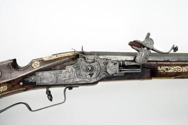 Keywords: Detalj lås hjullåsmusköt - Livrustkammaren - 74857.jpg Slätborrad rund pipa av stål med åttsidig kammare och två band på mitten av pipan Mynningen med trumf med tre svarvade ringar <br/>Riktmedel Skärm med siktskåra vid pipbasen Knoppkorn av mässing <br/>Fästning Fyra häften Pipan fäst med krysskruv underifrån varbygelskruven samt fyra pipstift av trä <br/><br/>Hjullås med plant låsbleck av stål tysk typ l 215 mm bladformig bakspets Graverad dekor över hela blecket naturscen sjövik med båtar Diana och hjort Upphöjd plan hjulkapsel med graverade trofégrupper nedanför hjulaxeln tre hål Fängpanna med avtagna nederhörn tungformig bakåtböjd eldskärm Fängpannelock med fast arm Hane med lös överkäke med graverad skärm krigare i antik rustning fyrkantigt käkskruvhuvud C-formigt uppåtböjt fingergrepp med svarvad knopp Hanhals med graverad krigare balusterformig hankropp med svarvad fot Hanstudel i form av en graverad skärm trofégrupp Bladformigt fjäderlöv <br/>Fästning Två låsskruvar <br/>Avtryckare med kraftig ollonliknande ände <br/><br/>Brun helstock med muskötkolv nedskuret tumläge Beslag och inläggningar av graverat ben kantlister och avlånga inläggningar omväxlande med graverade rullverk Bakplåt med sköld rullverk och bladdekor Utdragna trianglar på kolvsidorna på anslagssidan en rund platta med ett manshuvud ihjälm Laddstocksrännan täckt av benplatta med vriden banddekor och sköld överrörka och näsband med bladdekor Varbygel av stål bandformig s-formig svängd på bygeln fyra hål på bakre armen ett hål bakre stolpen spiralformigt upprullad <br/><br/>Tillbehör <br/>Laddstock l 1100 mm graverad benskoning med bladdekor l 65 mm original caption detalj lås hjullåsmusköt - LRK 3183 early other date century 17 steel e1247 - eldvapen - pipa lås riktmedel och beslag material stål - brass e4 - eldvapen - riktmedel material mässing - wood e3 - eldvapen - stock material trä - bone e78 - eldvapen - stockbeslag och stockdekor material ben size mm 1470 size mm 1120 pipa size mm 185 g 6050 LRK Carl Axel Fleetwood friherre Bernhard Axel Fleetwood friherre Gustava Charlotta Granath f Fleetwood Friherrinna place of origin original filename lm_dig2512 39760 inventory number LRK 3183 74857 CC-BY-SA Göran Schmidt <gallery caption Different images of same object > File Hjullåsmusköt 1600-talets början - Livrustkammaren - 60301 tif File Detalj stock hjullåsmusköt v sida - Livrustkammaren - 66295 jpg File Detalj lås-stock hjullåsmusköt - Livrustkammaren - 57734 jpg File Hjullåsmusköt 1600-talets början - Livrustkammaren - 43181 tif File Hjullåsmusköt 1600-talets början - Livrustkammaren - 68864 tif </gallery> Göran Schmidt Musket images from Livrustkammaren color images Media contributed by LSH dim-with multiple size templates Color images from Livrustkammaren Media contributed by LSH 2013-10 |