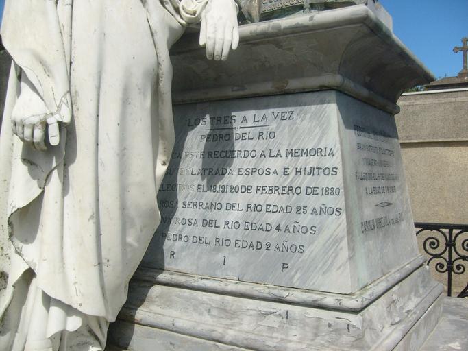 Keywords: Detalle de tumbra de familia de Pedro Del Río Zañartu.jpg es Esta es una vista de detalle de la escultura que decora la tumba de la familia de Pedro Del Río Zañartu en el Cementerio General de Concepción Chile es Se puede leer claramente el obituario que describen los sentimientos de don Pedro al morir casi simultáneamente su joven esposa y sus dos pequeños hijos También se encuentra se pultada allí su segunda esposa own Lady Bathory 2009-07-27 Pedro del Río Zañartu Cementerio General de Concepcion |