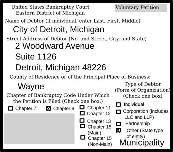 Keywords: Detroit bankruptcy.svg en picture of bankruptcy petition stylized it covers the basic elements from page 1 of Detroit's filing enough to create a summary for the article Also since this is simply text from a government filing it is automatically in the public domain 2014-09-10 16 34 57 own Rfc1394 cc-zero Uploaded with UploadWizard 2013 in Detroit Bankruptcy |