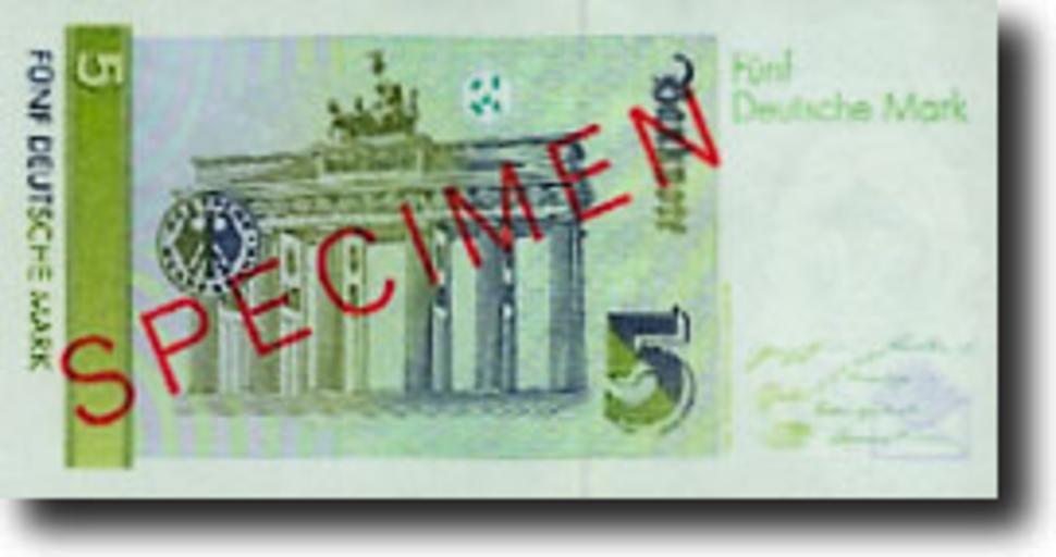 Keywords: DEU-5m-rev.jpg de 5 mark es 5 marcos Deutsche Bundesbank 1 August 1991 Ausgabe 27 Oktober 1992 http //www bundesbank de/Redaktion/DE/Downloads/Presse/Bildarchiv/ausgabe_und_aufruf_von_dm_banknoten_der_bank_deutscher_laender_und_der_deutschen_bundesbank pdf __blob publicationFile Serie BBk III Deutsche Bundesbank Frankfurt am Main Germany PD-Coa-Germany cc-by-2 0-de Grafiker Reinhold Gerstetter 1945 Fourth series banknotes of Germany 0005 19914 Banknotes with a face value of 5 |