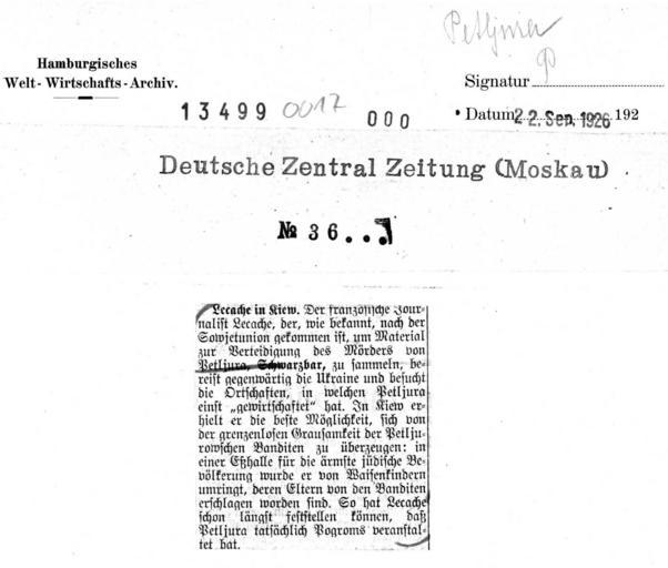 | Keywords: Deutsche Zentral Zeitung article from 1926.jpg Schwartzbard the murderer of Petliura is currently traveling in the Ukraine and visiting the locales in which Petliura once kept house In Kiev he obtained the best possibility to convince himself of the boundless brutality of the Petliurian bandits in a dining hall for the poorest Jewish populace he was surrounded by orphans whose parents were slain by the bandits Thus Lecache was finally able to ascertain that Petliura actually had organized pogroms 1926-09-22 German National Library of Economics http //webopac0 hwwa de/DigiJPG/P/13499/P134990017000000H jpg Deutsche Zentral Zeitung German Central Newspaper custom PD-old Communist newspapers Uploaded with UploadWizard |