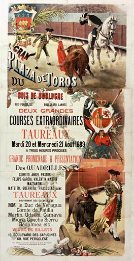 | Keywords: Deux grandes courses extraordinaires de taureaux.jpg Two great bull races Bois de Boulogne Paris 20 and 21 August 1889 Color lithogr 131 x 100 cm Bois de Boulogne Deux grandes courses extraordinaires de taureaux 20 et 21 août 1889 affiche / R Esteban ; P Perea lithogr en coul ; 131 x 100 cm btv1b9013301z 1889 Esteban R Perea P Assessments 1 Deux grandes courses extraordinaires de taureaux jpg/2 PD-old-70-1923 Files uploaded by Yann Forget Posters of France Bullfighting posters Historical images of the Bois de Boulogne 1889 in Paris Featured pictures of art Featured pictures of Paris Featured pictures by others nominated by Yann Forget |