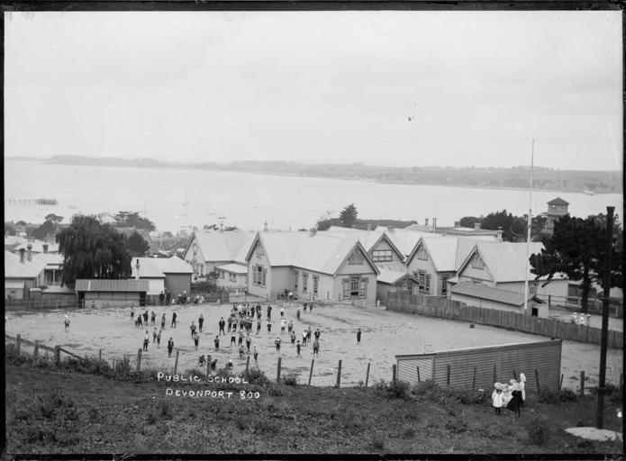 | Keywords: blackandwhite monochrome outdoor black and white View of Devonport school buildings and children at play in the playground and nearby. The boys' playground is separated by a fence on the right of the photograph. The Standard 6 room is the wing facing the flagpole; Standard 4 room is at rightangles; Primers' room is behind, and facing same direction as the Standard 4 room (see diagram on verso of file print). Five girls are in the immediate foreground behind a fence watching the boys in the playground. There is a wharf on the lefthandside of the photograph and St Heliers Bay, Kohimaramara, Mission Bay etc can be seen across the harbour in the distance. Photograph taken by William Price ca 1910 Inscriptions: Inscribed - Photographer's title on negative -bottom left: Public School. Devonport. 800. William Archer Price lived and practised in Queen Street, Northcote, 1909-1910. Source: New Zealand Post Office directories Quantity: 1 b&w original negative(s). Physical Description: Dry plate glass negative 4.5 x 6.5 inches Devonport Public School, Devonport. Price, William Archer, 1866-1948 :Collection of post card negatives. Ref: 1/2-000892-G. Alexander Turnbull Library, Wellington, New Zealand. natlib.govt.nz/records/23136134 View of Devonport school buildings and children at play in the playground and nearby. The boys' playground is separated by a fence on the right of the photograph. The Standard 6 room is the wing facing the flagpole; Standard 4 room is at rightangles; Primers' room is behind, and facing same direction as the Standard 4 room (see diagram on verso of file print). Five girls are in the immediate foreground behind a fence watching the boys in the playground. There is a wharf on the lefthandside of the photograph and St Heliers Bay, Kohimaramara, Mission Bay etc can be seen across the harbour in the distance. Photograph taken by William Price ca 1910 Inscriptions: Inscribed - Photographer's title on negative -bottom left: Public School. Devonport. 800. William Archer Price lived and practised in Queen Street, Northcote, 1909-1910. Source: New Zealand Post Office directories Quantity: 1 b&w original negative(s). Physical Description: Dry plate glass negative 4.5 x 6.5 inches Devonport Public School, Devonport. Price, William Archer, 1866-1948 :Collection of post card negatives. Ref: 1/2-000892-G. Alexander Turnbull Library, Wellington, New Zealand. natlib.govt.nz/records/23136134 |