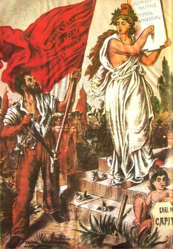 Keywords: Dezrobirea Muncitorilor (Lumea Nouă 11, 1895) MI aug73.jpg en Dezrobirea Muncitorilor Workers' Emancipation socialist chromolithograph in the Romanian magazine Lumea Nouă 11/1895 An unshackled proletarian carrying the red flag with the inscription Proletari din toate ţerile uniţi-vă Proletarians of all countries unite gazes at an allegorical female figure Social-Democraţia Social Democracy She holds up a tablet marked Drepturi Politice - Votul Universal Political Rights - Universal Suffrage The naked child in the foreground holds up a crest marked Carl Marx - Capitalul Karl Marx - Das Kapital The work is probably adapted from a non-Romanian source credited under Tantal's signature TANTAL după illegible Magazin Istoric August 1973 Tantal identified by signature bottom left 1895 1895 magazines 1895 in Romania Chromolithographs Allegories of socialism Phrygian caps Labour movement in Romania Marxism Socialists with red flags in art Workers of the world unite Magazines published in the Kingdom of Romania Universal suffrage PD-old |
