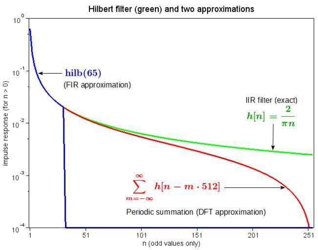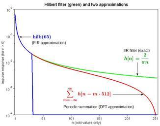 Keywords: DFT approximation to Hilbert filter.png The green graph is a section of the infinitely long Hilbert transform filter impulse response The blue graph is a shorter section produced by the Scilab function hilb for use as an FIR filter hilb apparently just applies a simple rect window but other windows are also possible When the filtering convolution is performed by multiplication of DFTs in the frequency domain circular convolution people sometimes replace the DFT of hilb with samples of the DTFT discrete-time Fourier transform of hn 2/ Ï n whose real and imaginary components are all just 0 or ±1 thereby avoiding actual multiplications But in that case the convolution is actually being done with the periodic summation of hn shown in red Unlike hilb it never goes to zero which means that the edge effects of circular convolution affect distort every output sample They can't simply be eliminated by discarding a few corrupted samples That effect is generally worse than the distortion caused by windowing the hn sequence even with the crude rectangular window example own 2007-09-27 Bob K Scilab script <source lang Scilab > N 256; // length of plots // Create a seqment of the IIR filter h_IIR zeros 1 N ; odd 1 2 N; for n odd h_IIR n 2/ pi n ; end // Create another filter by sampling the DTFT H_DFT i 0 -ones 1 N-1 ones 1 N ; h_DFT real fft H_DFT 1 ; // inverse FFT h_DFT h_DFT 2 ; // align with h_IIR // Create a 65-tap FIR Hilbert transform filter M 65; h_65 hilb M ; M2 M-1 /2; h_65 h_65 M/2+2 M zeros 1 N- M2-1 ; // align with other filters // Display the results r 5; g 3; b 2; // based on a call to getcolor plot2d odd' h_IIR odd ' h_DFT odd ' h_65 odd ' logflag nl style g r b rect 0 0 0001 256 1 frameflag 1 axesflag 1 ; title Hilbert filter green and two approximations fontsize 4 ; ylabel impulse response for n > 0 fontsize 3 ; xlabel n odd values only fontsize 3 ; f gcf ; a gca ; //a box on ; included in frameflag 1 a font_size 3; //set the tics label font size a x_ticks tlist ticks locations labels 1 51 101 151 201 251 1 51 101 151 201 251 ; f children 1 children children thickness 3; // Can do it this way when the thicknesses are not all the same // pb a children children 1 ; // Note that the order compared to style is LIFO // pr a children children 2 ; // pg a children children 3 ; // pg thickness 3; // pr thickness 3; // equivalent to set pr 'thickness' 3 ; // pb thickness 3; </source> LaTex <math>\color OliveGreen \boldsymbol hn \frac 2 \pi n </math> <math>\color Blue \boldsymbol \operatorname hilb 65 </math> <math>\color Red \boldsymbol \sum_ m -\infty \infty hn - m\cdot 512 </math> La bildo estas kopiita de wikipedia en La originala priskribo estas 1 date/time username edit summary source ---- 23 55 7 December 2005 en User Bob K <nowiki> I created this image myself using Matlab tools </nowiki> http //en wikipedia org/wiki/Image DFT_approximation_to_Hilbert_filter png en Image DFT approximation to Hilbert filter png Signal processing |