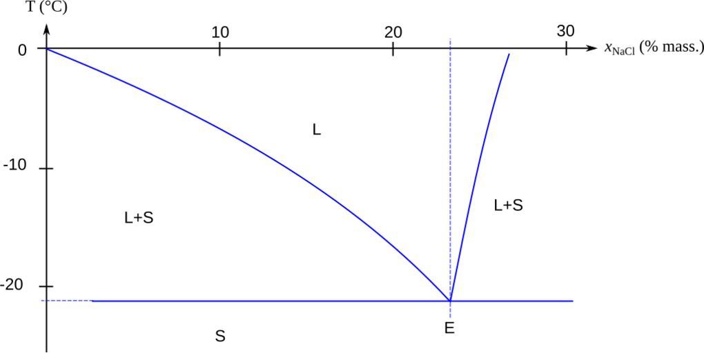 | Keywords: Diagramme binaire eau sel.svg en Binary phase diagram for the water + salt sodium chloride system; eutectic at 22 wt of salt T<sub>E</sub> -21 °C Caption L liquid; S solid; L+S solid and liquid mixture; E eutectic fr Diagramme binaire du système eau + sel chlorure de sodium ; eutectique à 22 massique de sel T<sub>E</sub> -21 °C Légende L liquide ; S solide ; L+S mélange liquide et solide ; E eutectique own Cdang 2009-05-13 from a PNG by the same author File Diag phase eau sel png Created with Inkscape Eutectic Water phase diagrams |