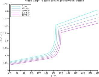 Keywords: Diagramme pvt PP semi cristallin modele Tait.svg fr Diagramme pvT d'un polypropylène semi-cristallin selon le modèle Tait à double domaine en pvT diagram for a semicrystalline polypropylene according to the Tait two-domain model 2013-07-09 11 02 03 own data from book Jian WANG PVT Properties of Polymers for Injection Molding Intech 2012 17 978-953-51-0297-7 http //cdn intechopen com/pdfs/33643/InTech-Pvt_properties_of_polymers_for_injection_molding pdf Cdang cdang Scilab source <source lang scilab > // // nom courbes_pvT_PP sce // auteur Christophe Dang Ngoc Chan // date de création 2013-07-08 // dates de modification // 2013-07-09 pressions en bar étendu à 500 bar // 2013-07-10 calcul du coefficient de dilatation //---------------------------------------------------------------------------- // version de Scilab 5 4 1 // module Atoms requis aucun //---------------------------------------------------------------------------- // Objectif trace un faisceau de courbes v f p // pour des températures données // Entrées aucune codé en dur // Sorties fenêtre graphique // // Initialisation clear; // Constantes // masse volumique CNPT rho 9; // kg/m 3 // modèle Tait à double domaine uSI // m molten fondu ; s solide b1m 1 306e-3; // m3 kg-1 b2m 9 019e-7; // m3 kg-1 K-1 b3m 7 43e7; // Pa b4m 4 006e-3; // K-1 b1s 1 1195e-3; // m3 kg-1 b2s 4 929e-7; // m3 kg-1 K-1 b3s 1 319e8; // Pa b4s 3 355e-3; // K-1 b5 417 64; // K b6 3 0225e-7; // K Pa-1 b7 9 623e-5; // m3 kg-1 b8 1 338e-1; // K-1 b9 3 973e-8; // Pa-1 C 0 0894; // abscisse Npoints 240; // nombre de courbes Tcelsius round linspace 20 260 Npoints ; // °C T Tcelsius + 273 15; // K // gamme de pression Npress 5; // nombre de faisceaux pbar 0 1 round 10 linspace 0 500 Npress ; // bar p 1e5 pbar; // Pa // carte de couleur cmap coolcolormap Npress ; xset colormap cmap ; // Fonctions function tetoile Tetoile b5 t // Objectif calcule T du modèle Tait // entrées paramètre b5 scalaire réel // t matrice réelle // sorties matrice réelle tetoile t - b5; endfunction function Tt temperature_transition b5 b6 p // Objectif calcule Tt du modèle Tait // entrée paramètres b5 b6 scalaires réels // p matrice réelle // sortie Tt matrice réelle Tt b5 + b6 p; endfunction function v0 vol_spec_0 b1m b1s b2m b2s Tt t tetoile // objectif calculer le volume spécifique à pression 0 du modèle Tait // entrées paramètres b1m b1s b2m b2s Tt scalaires réels // T T matrices réelles indice t < Tt ; v0 indice b1s + b2s tetoile indice ; v0 ~indice b1m + b2m tetoile ~indice ; endfunction function B sensibilite_pression b3m b3s b4m b4s Tt t tetoile // objectif calculer la sensibilité à la pression B du modèle Tait // entrées paramètres b3m b3s b4m b4s Tt scalaires réels // T T matrices réelles indice t < Tt ; B indice b3s exp -b4s tetoile indice ; B ~indice b3m exp -b4m tetoile ~indice ; endfunction function v vt b7 b8 b9 Tt p t tetoile // objectif calculer vt du modèle Tait // entrées paramètres b7 b8 b9 Tt p scalaires réels // T T matrices réelles indice t < Tt ; v indice b7 exp b8 tetoile indice - b9 p ; v ~indice 0; endfunction function v vol_spec T b1m b2m b3m b4m b1s b2s b3s b4s b5 b6 b7 b8 b9 C p // objectif calculer le volume spécifique du modèle Tait // entrées paramètres b1 b9 C p scalaires réels // températures T matrice de réels // sorties volumes spécifiques v matrice de réels tetoile Tetoile b5 T ; Tt temperature_transition b5 b6 p ; v0 vol_spec_0 b1m b1s b2m b2s Tt T tetoile ; B sensibilite_pression b3m b3s b4m b4s Tt T tetoile ; v_t vt b7 b8 b9 Tt p T tetoile ; v v0 1 - C log 1 + p /B + v_t; endfunction // Programme principal scf 0 ; clf; xtitle Modèle Tait pvT à double domaine pour le PP semi-cristallin \mathrm T \ °\mathrm C v\ \mathrm cm 3\cdot\mathrm g -1 ; volume_specifique zeros Npress Npoints ; // initialisation for P 1 Npress // faisceaux v vol_spec T b1m b2m b3m b4m b1s b2s b3s b4s b5 b6 b7 b8 b9 C p P ; volume_specifique P v; plot2d Tcelsius 1000 v ; h gce ; h children foreground P; end legend string pbar 1 + bar string pbar 2 + bar string pbar 3 + bar string pbar 4 + bar string pbar 5 + bar 2 xpoly T 1 T 1 1 1 1 scf 1 ; clf; xtitle Coefficient de dilatation volumique isobare modèle Tait \mathrm T \ °\mathrm C \beta\ 10 -6 \mathrm K -1 ; coef_dilat zeros Npress Npoints-2 ; // initialisation beta_d zeros 1 Npoints-2 ; for P 1 Npress // faisceaux for i 2 Npoints-1 beta_d i-1 volume_specifique P i+1 - volume_specifique P i-1 / T i+1 - T i - 1 volume_specifique P i ; end plot2d Tcelsius 2 -1 1e6 beta_d' ; h gce ; h children foreground P; h parent data_bounds 2 2 2000; end legend string pbar 1 + bar string pbar 2 + bar string pbar 3 + bar string pbar 4 + bar string pbar 5 + bar 2 </source> cc-zero Uploaded with UploadWizard Physical properties of polymers Thermodynamic diagrams Polypropylene |