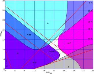 Keywords: Diagramme schaeffler soudure.svg en Schaeffler diagram for welding of stainless steel A austenite γ; F ferrite α; M martensite; 5-80 mass percentage of ferrite in austenite risk zones light blue hot cracking violet cold cracking pink embrittlement by α †’σ transformation grey embrittlement by growth of α grains white ideal zone fr Diagramme de Schaeffler pour la soudure des aciers inoxydables A austénite γ ; F ferrite α ; M martensite ; 5-80 pourcentage en masse de la ferrite dans l'austénite zones de risques bleu clair fissuration à chaud violet fissuration à froid pink fragilisation par transformation α †’σ gris fragilisation par croissance des grains α blanc zone idéale own Cdang 2009-05-29 Diagramme schaeffler text zoom svg File Diagramme schaeffler soudure simplifie svg Created with Inkscape Stainless steel Schaeffler diagrams |