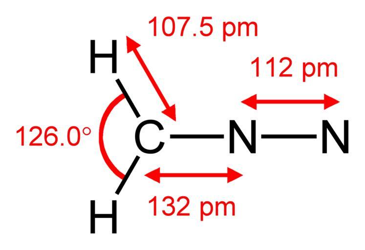| Keywords: Diazomethane-dimensions-from-CRC-MW-IR-2D.png Dimensions of the diazomethane molecule H<sub>2</sub>CN<sub>2</sub> Bond orders deliberately omitted for clarity Structural information determined by microwave and infrared spectroscopy from http //www hbcpnetbase com/ CRC Handbook 88<sup>th</sup> edition Structure drawn in http //www cambridgesoft com/software/details/ ds 2 dsv 73 ChemDraw Ultra 11 0 Own 2009-05-24 Ben Mills Benjah-bmm27 Images by Ben Mills Diazomethane | ||||