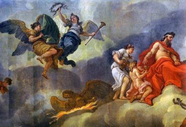 | Keywords: Die Einführung des Ganymed in den Olymp (van Loo).jpg Marble Hall Institution Neues Palais Potsdam Stiftung Preussische Schlösser und Gärten GK I 8143 <br>At 240 square meters 2 583 square feet this is the largest canvas ceiling painting north of the Alps <br>The chief changes between van Loo's preliminary oil sketch shown below and the final execution are the addition of Hebe and Hephaestus as well as the covering of the cartouche with a green cloth The cartouche in the oil sketch features a crown and the initials FR Fridericus Rex These changes were surely made at Friedrich's direction The addition of Hebe has been interpreted as a nod to Friedrich's beloved sister Wilhelmine The covering of his initials was seen by contemporaries as indicative of Friedrich's modesty <br>In Greek mythology Zeus made Ganymede cupbearer to the gods at Olympus supplanting Hebe Marmorsaal Institution Neues Palais Potsdam Stiftung Preußische Schlösser und Gärten GK I 8143 <br>Es ist mit 240 m² Fläche das größte Leinwanddeckengemälde nördlich der Alpen <br>Die Hauptunterschiede zwischen der unten abgebildeten vorläufigen Ölskizze und dieser Ausführung sind die Hinzufügung der Figuren Hebe und Hephaistos sowie die Verdeckung der Kartusche mit einem grünen Tuch Auf der Kartusche der Ölskizze sind eine Krone und die Buchstaben FR Fridericus Rex sichtbar Diese Änderungen erfolgten wohl auf Anweisung Friedrichs Die Hinzufügung von Hebe ist als Reverzerweisung an Friedrichs Lieblingsschwester Wilhelmine gedeutet worden Schon von Zeitgenossen wurde die Abdeckung von Friedrichs Initialen auf der Kartusche als Anzeichen seiner Bescheidenheit ausgelegt <br>In der griechischen Mythologie wurde Ganymed als Hirtenknabe von Zeus auf den Olymp entführt damit er dort Mundschenk für die Götter sei und ewig dort lebe In dieser Aufgabe löste er Hebe die Tochter des Zeus und der Hera gegen den Willen Heras ab 1768 Friederisiko Friedrich der Große Die Essays ed Generaldirektion der Stiftung Preußische Schlösser und Gärten Berlin-Brandenburg Munich Hirmer 2012 p 130 artwork Creator Charles-Amédée-Philippe van Loo file James Steakley https //commons wikimedia org/wiki/Die_Einf C3 BChrung_des_Ganymed_in_den_Olymp_ 28van_Loo 29 Gallery view thumb left In the preliminary oil sketch angels bear a shield with a crown and Friedrich's initials thumb left The final version includes Hebe at left and Hephaestus below thumb left A drape conceals Friedrich's initials on the shield PD-Art-100 ImageNote 1 1368 526 228 162 2202 1512 2 Hebe Juventas ImageNoteEnd 1 ImageNote 2 1522 730 250 190 2202 1512 2 Ganymede Catamitus ImageNoteEnd 2 ImageNote 3 1839 399 256 176 2202 1512 2 Zeus Jupiter ImageNoteEnd 3 ImageNote 4 647 1096 468 174 2202 1512 2 Golden Eagle sacred to Zeus Jupiter who took the form of an eagle to abduct Ganymede ImageNoteEnd 4 ImageNote 5 308 185 628 468 2202 1512 2 Angels bearing a draped cartouche that originally showed a crown and Friedrich's initials ImageNoteEnd 5 The Induction of Ganymede in Olympus van Loo |