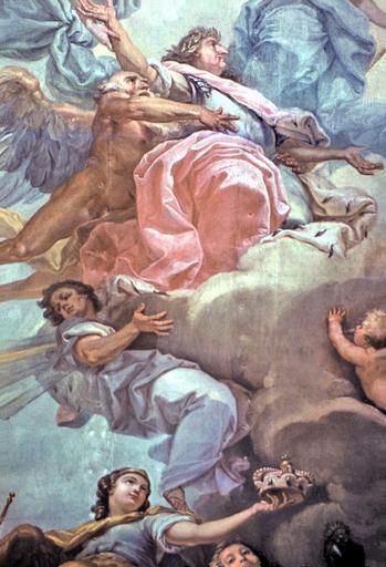 Keywords: Die Erhebung des Großen Kurfürsten in den Olymp (van Loo) - Apotheose.jpg The Elevation of the Great Elector into Olympus Oil on canvas destroyed in World War II Ceiling painting detail apotheosis of the Great Elector City Palace Potsdam Die Erhebung des Großen Kurfürsten in den Olymp Öl auf Leinwand Kriegsverlust Deckengemälde Ausschnitt Apotheose des Großen Kurfürsten Stadtschloss Potsdam 20366819 LAC 9 003/32 fmlac9003_32 <br /> Foto Peter Cürlis; color ; Aufnahme-Datum um 1944 04/1944 08; Zugang Dauerleihgabe Kunsthistorisches Institut der Universität Mainz Fotoinhalt Ausschnitt oben der Kurfürst mit Chronos artwork Creator Charles-Amédée-Philippe van Loo file James Steakley 1751 Die Erhebung des Großen Kurfürsten in den Olymp van Loo PD-old-100-1923 The Elevation of the Great Elector into Olympus van Loo Ceremonial royal mantles Ermine clothing in art