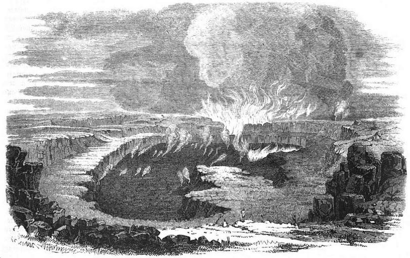 Keywords: Die Gartenlaube (1853) b 037.jpg de žEs ist eine treue Abbildung von dem Krater des Vulkans Kilauea auf der Insel Hawai welche die höchste der Sandwichinseln im großen Ocean ist Der Krater dieses Vulkans liegt 3630 Fuß über der Meeresfläche auf dem nordöstlichen Abhange des mit ewigem Schnee bedeckten 14 900 Fuß hohen Mauna-Roa der also höher als der Mont-blanc der höchste Berg Europa ™s ist Wir übersehen einen großen Theil des Abhanges der sich von uns ab nach dem Meeresspiegel etwas senkt jedoch nicht so sehr daß wir das 3630 Fuß tiefer liegende Meer sehen könnten So weit das Auge auf dem Bilde reicht sehen wir die Bergebene zerrissen und von tiefen Schluchten durchzogen Wahrscheinlich ist das meiste an den sichtbaren Felsmassen Basalt Lava Bimsstein Schwefel und anderes Gestein welches meist heißflüssig aus dem Erdinnern auf diese Höhe emporgequollen ist In der Mitte des Bildes sehen wir den eigentlichen Krater Es ist ein furchtbarer in die Länge gezogener Schlund welcher bis etwa 100 Fuß unter seinem Rande mit flüssiger Lava angefüllt ist Leicht gekräuselte Säulen von gelbweißen Schwefel-Dämpfen steigen aus der Fläche des drohenden Lavameeres hervor und eine Wolkenschicht von Dampf und Rauch schwebt über diesem Orte der fürchterlichen Naturgewalt Jetzt liegt er ruhig und nicht weit von dem unheildrohenden Rande wachsen Farren-Kräuter und kleine Sträucher “ im nächsten Augenblicke kann aus der trügerischen Ruhe der glühende Lavaspiegel aufschäumen über den Rand steigen und in zerstörendem Flusse an den Seiten des Berges hinabschießen Aus den Schlünden welche nahe dem Krater sind steigen Schwefeldämpfe aus dem entfernteren Wasserdämpfe hervor; jene bekleiden den Boden mit den schönsten Krystallen gediegenen Schwefels diese entlocken ihm in der Nähe des Verderbens üppigen Pflanzenwuchs Also ist der Schlund der Vulkane nicht immer ein Bild des Todes in der Zerstörung Namentlich sind die innern Wände der Krater oft mit den prächtigsten Farben geziert vom lebhaften Schwefelgelb bis zum brennenden Zinnoberroth finden sich in den reinsten Tönen alle Schattirungen Johannes Frisch 1853 Aus der Menschenheimath Vierter Brief Die Vulkane in Die Gartenlaube 1853 The Garden Arbor pages 36 to 38 037 KÄ«lauea in art Lava lakes of KÄ«lauea Lava lakes in art |