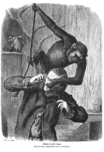 Keywords: Die Gartenlaube (1874) b 065.jpg 065 066 Creator Heinrich Leutemann Mafuca in guter Laune Nach der Natur aufgenommen von H Leutemann <br />Bild aus Seite 65 in Die Gartenlaube 1874 Image from page 65 of book Die Gartenlaube 1874 People with animals in art Drawings of chimpanzees Heinrich Leutemann |