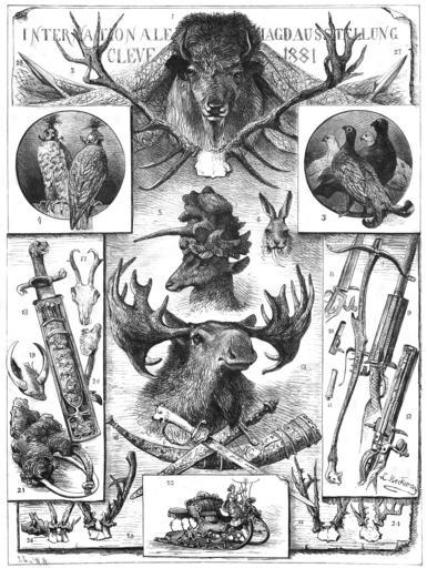 Keywords: Die Gartenlaube (1881) b 745.jpg 1 Amerikanischer Bisonkopf “ 2 Ungarisches Hirschgeweih “ 3 Bastarde vom Auer- Birk- und Schneehuhn aus Norwegen “ 4 Irländische Jagdfalken “ 5 Monströses Hirschgeweih “ 6 Hasenkopf mit abnormen Schneidezähnen “ 7 Armbrust mit langem Anschlag aus dem 15 Jahrhundert “ 8 Hinterlader vom Anfang des 18 Jahrhunderts “ 9 Doppelwender mit 4 Läufen “ 10 und 11 Eiserne Patronen zu Nr 8 “ 12 Revolver vom Anfang des 18 Jahrhunderts “ 13 Kopf eines Elenhirsches “ 14 Altes Jagdmesser mit Elfenbeinscheide “ 15 Hirschfänger mit Elfenbeingriff aus dem 17 Jahrhundert “ 16 GroĂźes Jagdhorn aus einem Elephantenzahn “ 17 Schädel einer Gabelgemse “ 18 Zerwirkmesser aus dem 17 Jahrhundert “ 19 Kolossale Hauer eines Wildschweins “ 20 VerkrĂĽppelter Rehlauf “ 21 Fuchseisen mit einem Baumstamme verwachsen “ 22 Rococo-Jagdschlitten “ 23 “26 Prachtgehörne aus der Sammlung H Lantz “ 27 und 28 Saufeder und Prellnetz Die_Gartenlaube_ 1881 _745 jpg Die_Gartenlaube_ 1881 _746 jpg PD-old Ludwig Beckmann Hunting in art Hunting dagger |
