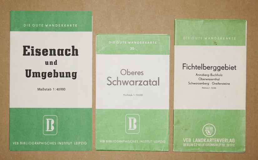 Keywords: Die Gute Wanderkarte.jpg de Fotografie von drei Exemplaren der Guten Wanderkarte erschienen 1954 bis 1961 own Frank-Ri 2011-01-17 Cc-zero Maps of Eisenach