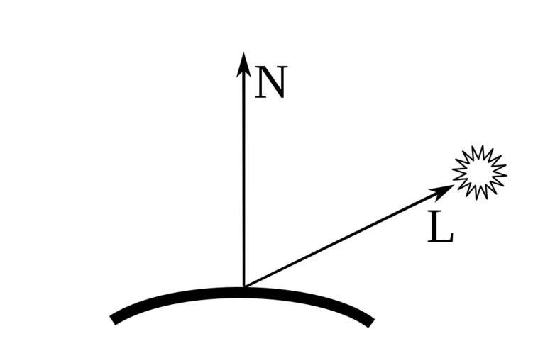 Keywords: Diffuse Reflection Vectors.svg en A diagram showing the vectors used in calculating diffuse lighting relative to a surface point N the surface normal L normalized vector in direction of light source Image originally created by User Fuzzypeg in Inkscape and modified by User Martin Kraus; released to the public domain 2011-06-17 own Martin Kraus cc-zero Uploaded with UploadWizard Illustrations Compuer Science |