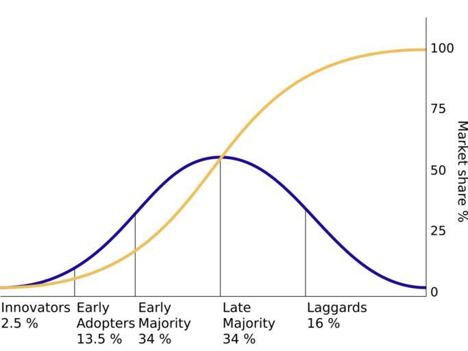Keywords: Diffusion of ideas.svg en The diffusion of innovations according to Rogers 1962 With successive groups of consumers adopting the new technology shown in blue its market share yellow will eventually reach the saturation level no Graf som viser diffusjon og spredning av ideer og praksis i samfunnet basert på Rogers 1962 De ulike gruppene som adopterer en idé eller teknologi blå vil til slutt nå et metningsnivå gul 2012-02-28 Based on Rogers E 1962 Diffusion of innovations Free Press London NY USA Rogers Everett Uploaded with UploadWizard Technical diagrams Sociology Innovation Diffusion Marketing Product management Product life cycle diagrams |