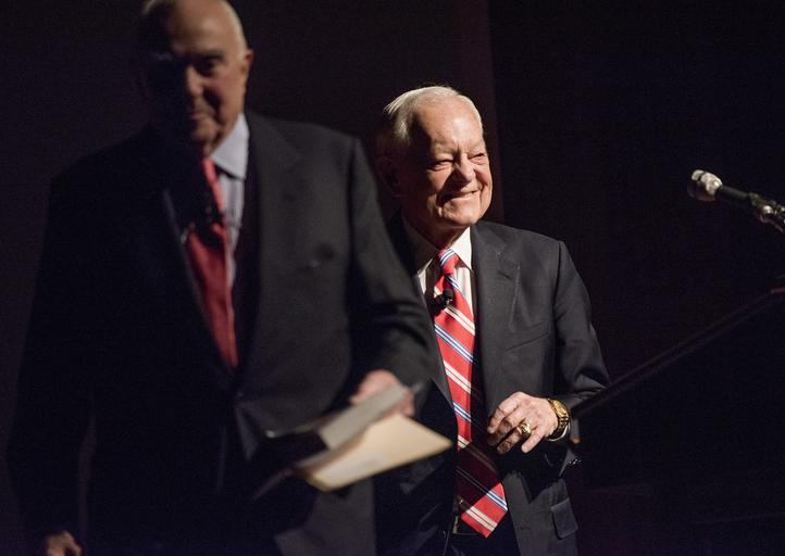 | Keywords: lbj library lbjlibrary austin texas tx usa indoor Former Face the Nation television anchor and veteran journalist Bob Schieffer discussed his storied career with Joseph Califano, Jr., domestic policy advisor to President Johnson, on Thursday evening, Jan. 21, 2016, at the LBJ Presidential Library auditorium. Schieffer retired in May 2015, in his 58th year as a reporter and his 46th year at CBS News. He is one of the few broadcast or print journalists to have covered all four major beats in the nation's capital – the White House, the Pentagon, the State Department and Capitol Hill. He won eight Emmys and numerous other journalism awards. Califano is founder and chairman of the board of The National Center on Addiction and Substance Abuse (CASA) at Columbia University and serves as a trustee of the LBJ Foundation. LBJ Library photo by Jay Godwin - January 21, 2016 Former Face the Nation television anchor and veteran journalist Bob Schieffer discussed his storied career with Joseph Califano, Jr., domestic policy advisor to President Johnson, on Thursday evening, Jan. 21, 2016, at the LBJ Presidential Library auditorium. Schieffer retired in May 2015, in his 58th year as a reporter and his 46th year at CBS News. He is one of the few broadcast or print journalists to have covered all four major beats in the nation's capital – the White House, the Pentagon, the State Department and Capitol Hill. He won eight Emmys and numerous other journalism awards. Califano is founder and chairman of the board of The National Center on Addiction and Substance Abuse (CASA) at Columbia University and serves as a trustee of the LBJ Foundation. LBJ Library photo by Jay Godwin - January 21, 2016 |