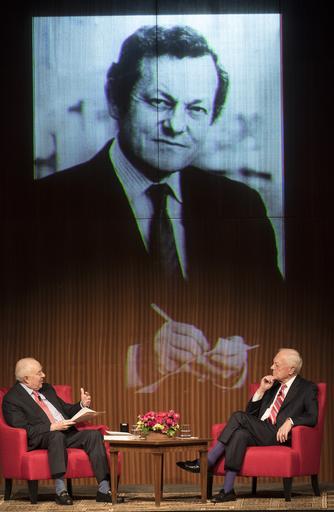 Keywords: lbj library lbjlibrary austin texas tx usa people Former Face the Nation television anchor and veteran journalist Bob Schieffer discussed his storied career with Joseph Califano, Jr., domestic policy advisor to President Johnson, on Thursday evening, Jan. 21, 2016, at the LBJ Presidential Library auditorium. Schieffer retired in May 2015, in his 58th year as a reporter and his 46th year at CBS News. He is one of the few broadcast or print journalists to have covered all four major beats in the nation's capital – the White House, the Pentagon, the State Department and Capitol Hill. He won eight Emmys and numerous other journalism awards. Califano is founder and chairman of the board of The National Center on Addiction and Substance Abuse (CASA) at Columbia University and serves as a trustee of the LBJ Foundation. LBJ Library photo by Jay Godwin - January 21, 2016 Former Face the Nation television anchor and veteran journalist Bob Schieffer discussed his storied career with Joseph Califano, Jr., domestic policy advisor to President Johnson, on Thursday evening, Jan. 21, 2016, at the LBJ Presidential Library auditorium. Schieffer retired in May 2015, in his 58th year as a reporter and his 46th year at CBS News. He is one of the few broadcast or print journalists to have covered all four major beats in the nation's capital – the White House, the Pentagon, the State Department and Capitol Hill. He won eight Emmys and numerous other journalism awards. Califano is founder and chairman of the board of The National Center on Addiction and Substance Abuse (CASA) at Columbia University and serves as a trustee of the LBJ Foundation. LBJ Library photo by Jay Godwin - January 21, 2016