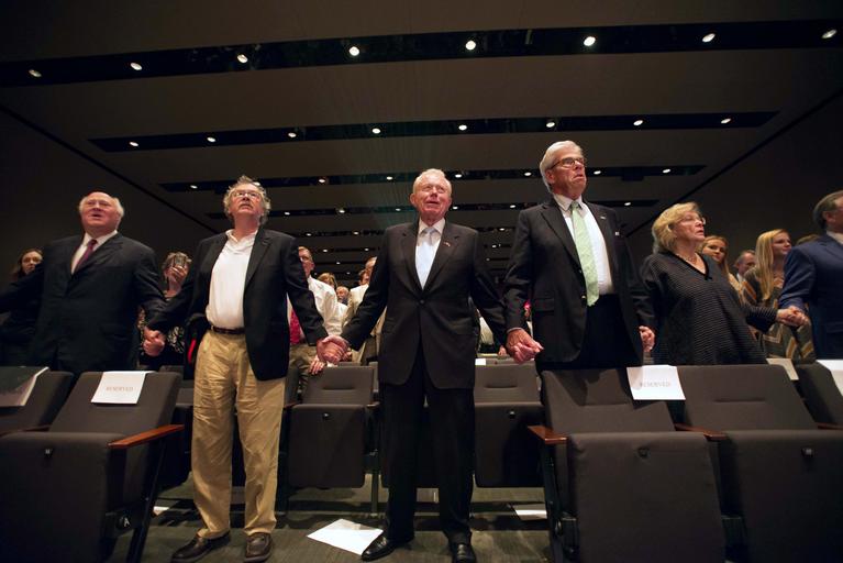 | Keywords: austin texas indoor The audience at the LBJ Presidential Library stands and sings along as folk singer Peter Yarrow, performs "Where Have All The Flowers Gone?" on Thursday, April 28, 2016. The event was part of the library’s three-day Vietnam War Summit. At center is Ben Barnes, vice chairman of the LBJ Foundation Board of Trustees, former Lt. Gov. of Texas, and former Speaker of the Texas House of Representatives.   Yarrow, who used to perform with folk group Peter, Paul and Mary, was part of the huge 1969 moratorium rally in Washington, D.C. against the Vietnam War. He participated in a panel discussion at the LBJ Library with singer/songwriter Country Joe McDonald, a Navy veteran, who wrote one of the most memorable Vietnam War protest songs, "I Feel Like I'm Fixin' to Die Rag," for his band, Country Joe and the Fish. The two discussed how the music of the 1960s and 1970s helped to comfort U.S. troops in Vietnam while fueling the anti-war movement at home.   The music discussion was moderated by Bob Santelli, executive director of the GRAMMY Museum.  LBJ Library photo by Marsha Miller 04/28/2016.  The audience at the LBJ Presidential Library stands and sings along as folk singer Peter Yarrow, performs "Where Have All The Flowers Gone?" on Thursday, April 28, 2016. The event was part of the library’s three-day Vietnam War Summit. At center is Ben Barnes, vice chairman of the LBJ Foundation Board of Trustees, former Lt. Gov. of Texas, and former Speaker of the Texas House of Representatives.   Yarrow, who used to perform with folk group Peter, Paul and Mary, was part of the huge 1969 moratorium rally in Washington, D.C. against the Vietnam War. He participated in a panel discussion at the LBJ Library with singer/songwriter Country Joe McDonald, a Navy veteran, who wrote one of the most memorable Vietnam War protest songs, "I Feel Like I'm Fixin' to Die Rag," for his band, Country Joe and the Fish. The two discussed how the music of the 1960s and 1970s helped to comfort U.S. troops in Vietnam while fueling the anti-war movement at home.   The music discussion was moderated by Bob Santelli, executive director of the GRAMMY Museum.  LBJ Library photo by Marsha Miller 04/28/2016. |