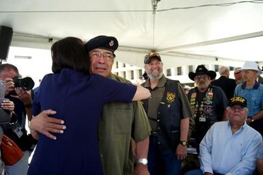 Keywords: Vietnam veteran Ignacio Perez of Austin sheds tears as he hugs Luci Baines Johnson, daughter of President Lyndon Johnson and Lady Bird Johnson, at a Vietnam veterans recognition ceremony outside the LBJ Presidential Library on Wednesday, April 27, 2016. Each veteran at the ceremony received a Vietnam veteran lapel pin engraved on the back with “A Grateful Nation Thanks and Honors You.” The LBJ Library is hosting a three-day Vietnam War Summit from April 26-28. LBJ Library photo by Nick Ut 04/27/2016. Vietnam veteran Ignacio Perez of Austin sheds tears as he hugs Luci Baines Johnson, daughter of President Lyndon Johnson and Lady Bird Johnson, at a Vietnam veterans recognition ceremony outside the LBJ Presidential Library on Wednesday, April 27, 2016. Each veteran at the ceremony received a Vietnam veteran lapel pin engraved on the back with “A Grateful Nation Thanks and Honors You.” The LBJ Library is hosting a three-day Vietnam War Summit from April 26-28. LBJ Library photo by Nick Ut 04/27/2016. |