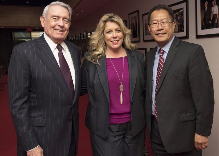 Keywords: dig13960_088.jpg dig13960088jpg austin tx usa people groupshot indoor suit Dan Rather, Rhonda Summerbell and Yung Tran On Tuesday evening November 1st, 2016, veteran journalist Dan Rather joined Friends of the LBJ Library members to speak about his remarkable career spanning six decades in print, radio, and television news. Rather, a native Texan, has covered almost every major news event since the 1960s, including President John F. Kennedyâs assassination, the U.S. civil rights movement, the Vietnam War, the Watergate scandal, the fall of the Berlin Wall, and the 9/11 terrorist attacks. He was anchor and managing editor of the CBS Evening News for 24 years. He now serves as president and CEO of News and Guts, an independent production company. The evening was co-hosted by the Dolph Briscoe Center for American History at the University of Texas at Austin. LBJ Library photo by Jay Godwin 11/01/2016 Dan Rather, Rhonda Summerbell and Yung Tran On Tuesday evening November 1st, 2016, veteran journalist Dan Rather joined Friends of the LBJ Library members to speak about his remarkable career spanning six decades in print, radio, and television news. Rather, a native Texan, has covered almost every major news event since the 1960s, including President John F. Kennedyâs assassination, the U.S. civil rights movement, the Vietnam War, the Watergate scandal, the fall of the Berlin Wall, and the 9/11 terrorist attacks. He was anchor and managing editor of the CBS Evening News for 24 years. He now serves as president and CEO of News and Guts, an independent production company. The evening was co-hosted by the Dolph Briscoe Center for American History at the University of Texas at Austin. LBJ Library photo by Jay Godwin 11/01/2016