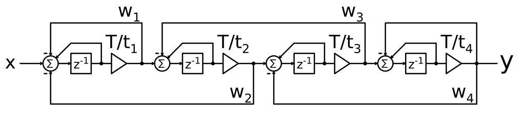 Keywords: Digital leapfrog filter order 4.svg en 4th order digital leapfrog filter own Fcorthay Cc-zero Electronic filters Filter circuits