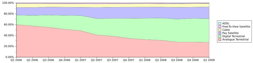 Keywords: Digital TV (UK) Figures All sets.svg en UK digital penetration Q3 2008 all sets Ofcom figures Created by uploader - recreation of w File Digital_TV_ UK _Figures_All_sets png in SVG AJCham2097 2009-07-20 Graph last updated for OFCOM figures for 2009 Q1 Graph greated with Gnumeric Digital television |