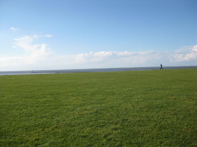 Keywords: dike meadow horizon grass north sea sea watts lonely blue green