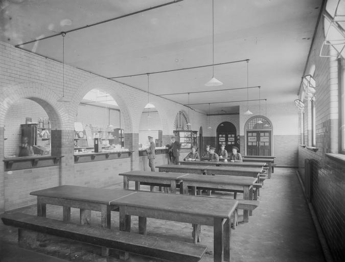 | Keywords: curragh camp curraghcamp curragh kildare ireland leinster soldiers refectory coffee room coffeeroom marsh's biscuits marshsbiscuits belfast oxo sunday july 1916 1910s vending machine vendingmachine glass negative glassnegative suppers 16 elise sandes elisesandes soldiers home soldiershome sandes centres for soldiers and airmen sandescentresforsoldiersandairmen eason eason & son easonson eason collection easoncollection national library of ireland nationallibraryofireland explore blackandwhite monochrome black and white Following on from yesterday's photo of soldiers in the Reading Room at the Elise Sandes Soldiers Home at the Curragh Camp in Kildare, this photo is of the Dining Room. Thanks to macabee2012 for the following: "This is the dining room of Miss Sandes Soldiers Home in the Curragh - one of over thirty such Homes attached to army locations all over Ireland, Founded by Elise Sandes of Tralee, Co Kerry, this network of Soldiers Homes was an evangelical missionary movement designed mainly to keep young soldiers out of the pubs and provide recreational facilities - as well as a bit of religion. The first Home was in Cork and later ones were in Queesntown (Cobh), Belfast, Parkgates Dublin, Ballykinler, Derry, among other towns; there were eight Homes in India in places such as Rawal Pindi, Quetta and Lucknow. See History Ireland, vol. 13, issue 4, July/August 2005..." This photo incidentally provides invaluable information about what the soldiers were eating at the time for their supper, and how much they were paying for their grub. A blackboard behind the counter lists dishes and prices. We're assuming the cost was in pennies rather than shillings. Here they are (those that were possible to read): Eggs & Bacon 3 Two Eggs 4/5? Bacon & Tomatoes 4 Bacon & Onions 3 Bacon & Chips 3 Rissoles & Chips 3 Rissoles & Onions 3 Desserts Apple Tart & Custard 2 Treacle & Custard or Rice 1 Blancmange & Jelly 2 Rice Pudding 1 Gorgeous account in from scooter2017 of this Dining Room in the 1960s: "You could add another 50 years to this 1916 photo and little had changed. The long benches and tables were still the same. They did add a jukebox in the early 60s. It was in front of the pillar where that first soldier is standing. A record could be played for 3d. Date: Sunday, 16 July 1916 NLI Ref.: EAS_2486 Following on from yesterday's photo of soldiers in the Reading Room at the Elise Sandes Soldiers Home at the Curragh Camp in Kildare, this photo is of the Dining Room. Thanks to macabee2012 for the following: "This is the dining room of Miss Sandes Soldiers Home in the Curragh - one of over thirty such Homes attached to army locations all over Ireland, Founded by Elise Sandes of Tralee, Co Kerry, this network of Soldiers Homes was an evangelical missionary movement designed mainly to keep young soldiers out of the pubs and provide recreational facilities - as well as a bit of religion. The first Home was in Cork and later ones were in Queesntown (Cobh), Belfast, Parkgates Dublin, Ballykinler, Derry, among other towns; there were eight Homes in India in places such as Rawal Pindi, Quetta and Lucknow. See History Ireland, vol. 13, issue 4, July/August 2005..." This photo incidentally provides invaluable information about what the soldiers were eating at the time for their supper, and how much they were paying for their grub. A blackboard behind the counter lists dishes and prices. We're assuming the cost was in pennies rather than shillings. Here they are (those that were possible to read): Eggs & Bacon 3 Two Eggs 4/5? Bacon & Tomatoes 4 Bacon & Onions 3 Bacon & Chips 3 Rissoles & Chips 3 Rissoles & Onions 3 Desserts Apple Tart & Custard 2 Treacle & Custard or Rice 1 Blancmange & Jelly 2 Rice Pudding 1 Gorgeous account in from scooter2017 of this Dining Room in the 1960s: "You could add another 50 years to this 1916 photo and little had changed. The long benches and tables were still the same. They did add a jukebox in the early 60s. It was in front of the pillar where that first soldier is standing. A record could be played for 3d. Date: Sunday, 16 July 1916 NLI Ref.: EAS_2486 |