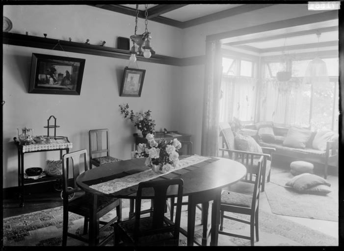 | Keywords: blackandwhite monochrome indoor room dining room black and white A view of a dining room with a bay window, showing round dining table, dining chairs and a trolley. By the window is a settee covered with cushions and an arm chair. Photograph taken by William Price ca 1920s. Quantity: 1 b&w original negative(s). Physical Description: Dry plate glass negative Dining room, showing furniture. Price, William Archer, 1866-1948 :Collection of post card negatives. Ref: 1/2-000816-G. Alexander Turnbull Library, Wellington, New Zealand. natlib.govt.nz/records/22753142 A view of a dining room with a bay window, showing round dining table, dining chairs and a trolley. By the window is a settee covered with cushions and an arm chair. Photograph taken by William Price ca 1920s. Quantity: 1 b&w original negative(s). Physical Description: Dry plate glass negative Dining room, showing furniture. Price, William Archer, 1866-1948 :Collection of post card negatives. Ref: 1/2-000816-G. Alexander Turnbull Library, Wellington, New Zealand. natlib.govt.nz/records/22753142 |