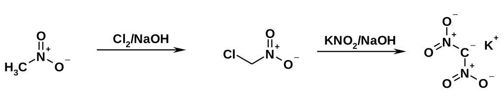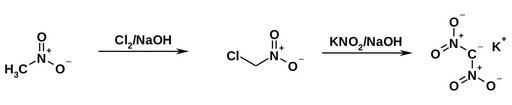 Keywords: Dinitromethane synthesis 01.svg en Synthesis of dinitromethane potassium salt de Synthese von Dinitromethan Kaliumsalz own Steffen 962 2010-09-19 PD-chem Dinitromethane
