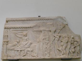 Keywords: Dionysos and Ikarios - Farnese Collection - MANN 6713 - LDR 1322.JPG it Rilievo in marmo con Dioniso ed Ikario facente parte della Collezione Farnese non della Collezione Borgia oggi al Museo Archeologico Nazionale di Napoli inv 6713 Il rilievo di cui sono note altre repliche in diversi musei del mondo mostra Dioniso come vecchio ebbro sostenuto da un satirello e seguito da un corteo di Satiri e Menadi che arriva in casa di Ikarios disteso su di una kline in compagnia di una donna <br> attenzione In S De Caro Il Museo Archeologico Nazionale di Napoli Napoli 1994 il rilievo è attribuito erroneamente alla Collezione Borgia derivato dall'inventario generale dove è segnato in matita Borgia own DenghiùComm 2010-11-02 <gallery> File Poet Dionysos Louvre Ma1606 jpg in the Louvre File Bacchus and Attendants Visiting Icarus jpg in the British Museum File Arte romana dioniso che visita l'attore ateniese ikarios da efeso 01 JPG in Izmir from Ephesus </gallery> Ancient Roman reliefs from the Farnese Collection now in Naples 6713 Icarius Athens 6713 Reliefs of Dionysos 6713 |