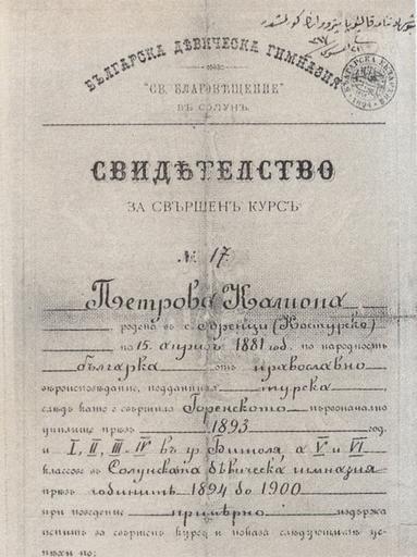 | Keywords: Diploma-from-Bulgarian-women-school-Thessaloniki.jpg Свидетелство за завъ шен ку с издадено от бълга ската девическа гимназия Св Благовещение Солун 11 юни 1900 г пъ ва ст аница en Graduation diploma issued by the Holy Annunciation Bulgarian Girls' School of Solun Thessaloniki Issued on June 11 1900 page 1 Scanned from History of Bulgaria Bulgarian Academy of Sciences Исто ия на Бълга ия Том 7 Бълга ия 1878 - 1903 Издателство на БА София 1991 ст 434 Issued on 11 June 1900 - PD-old Historical documents of Bulgaria Thessaloniki in the Ottoman era 11 June June 1900 |