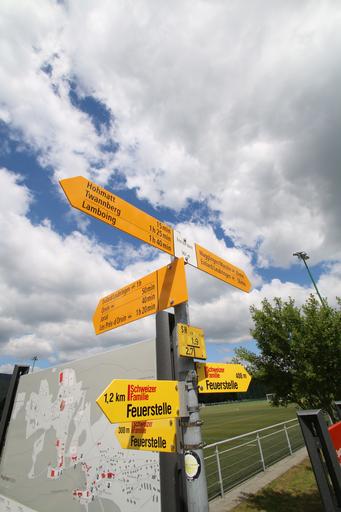 Keywords: directory direction shield signposts away note path direction trail target sky clouds wise direction weganzeiger