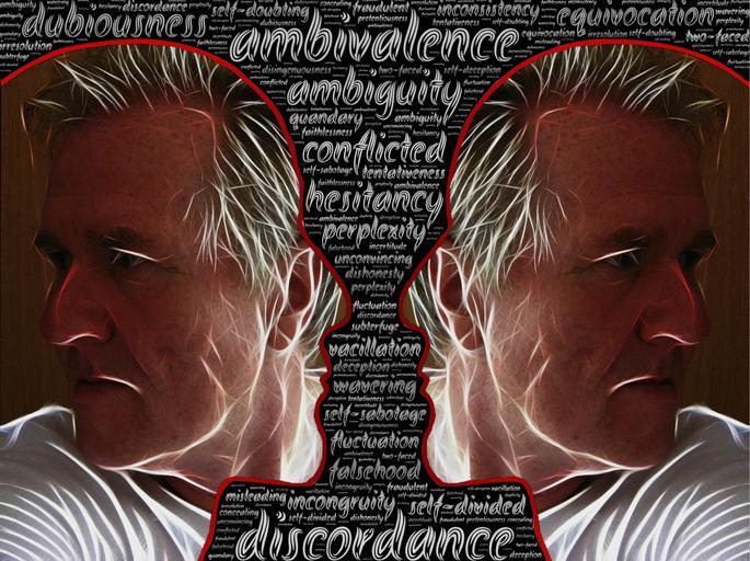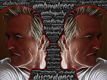 Keywords: discordance ambivalence ambiguity equivocation conflicted hesitancy faithlessness dubiousness irresolution self-divided perplexity incongruity inconsistency self-sabotage self-doubting falsehood pretentiousness incertitude vacillation wavering fluctuation indecision tentativeness unconvincing two-faced dishonesty deception disingenuousness misleading fraudulence self-deception speciousness concealing duplicity subterfuge |