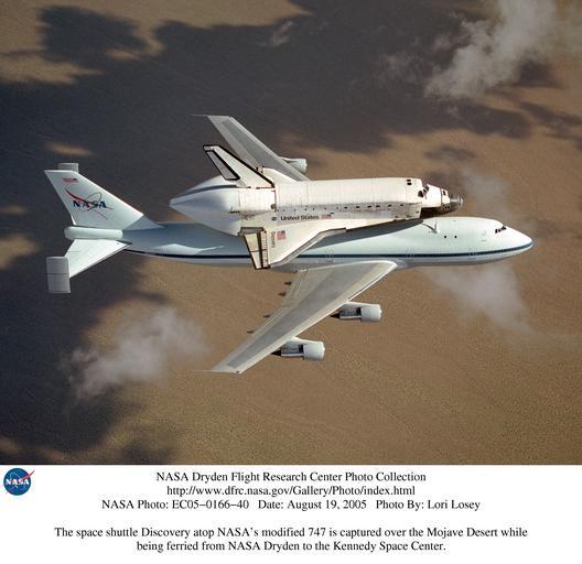 Keywords: Discovery Atop 747 Over The Mojave (EC05-0166-40) DVIDS724327.jpg en NASA's modified Boeing 747 Shuttle Carrier Aircraft with the Space Shuttle Discovery on top lifts off from Edwards Air Force Base to begin its ferry flight back to the Kennedy Space Center in Florida The cross-country journey will take two days with stops at several intermediate points for refueling Space shuttle Discovery landed safely at NASA's Dryden Flight Research Center at Edwards Air Force Base in California at 5 11 22 a m PDT August 9 2005 following the very successful 14-day STS-114 return to flight mission During their two weeks in space Commander Eileen Collins and her six crewmates tested out new safety procedures and delivered supplies and equipment the International Space Station Discovery spent two weeks in space where the crew demonstrated new methods to inspect and repair the Shuttle in orbit The crew also delivered supplies outfitted and performed maintenance on the International Space Station A number of these tasks were conducted during three spacewalks In an unprecedented event spacewalkers were called upon to remove protruding gap fillers from the heat shield on Discovery's underbelly In other spacewalk activities astronauts installed an external platform onto the Station's Quest Airlock and replaced one of the orbital outpost's Control Moment Gyroscopes Inside the Station the STS-114 crew conducted joint operations with the Expedition 11 crew They unloaded fresh supplies from the Shuttle and the Raffaello Multi-Purpose Logistics Module Before Discovery undocked the crews filled Raffeallo with unneeded items and returned to Shuttle payload bay Discovery launched on July 26 and spent almost 14 days on orbit NASA Identifier nasahqphoto-6841309022 2012-06-15 Glenn Research Center https //www dvidshub net/image/724327 724327 2012-10-15 17 23 WASHINGTON DC US PD-USGov Edwards Air Force Base Images from DoD uploaded by Fæ Space Shuttle Discovery |