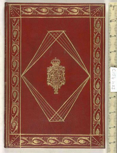 Keywords: Discurso pronunciado el dia 16 de Mayo de 1830 en la abertura de la Real Academia de los Caballeros Cadetes de Artilleria en Alcal-a de Henares - Upper cover (c154h23).jpg Style Armorial Cortina or curtain Frame; Caption Upper cover; Colour Red; Edge Unspecified exhibition history Decorative Technique Tooled in gold; Cover Material Goatskin includes morocco turkey etc Part of the Charles Ramsden Collection of Signed Bindings Macchi states; first quarter century Spain cortina style in corners C 154 h 20 C 154 h 21 C 154 n 4 and Charles III arms Matilde López Serrano Biblioteca de Palacio Madrid 1950 p 102 n 44/1 on Kalendario manual y guia de forasteros en Madrid para el año de 1807 Madrid Imprenta Real 1806 suggest object history Text 1830; Madrid; Spain royal arms object type Cc-zero place of creation Binding Spain place of discovery Great bndings from the Spanish royal collections Madrid 2012 British Library image http //www bl uk/catalogues/bookbindings/LargeImage aspx RecordId 020-000001354 ImageId ImageId 40282 Copyright BL Discurso pronunciado el dia 16 de Mayo de 1830 en la abertura de la Real Academia de los Caballeros Cadetes de Artilleria en Alcal a de Henares Uploaded with GWToolset Discurso pronunciado el dia 16 de Mayo de 1830 en la abertura de la Real Academia de los Caballeros Cadetes de Artilleria en Alcal a de Henares - Upper cover c154h23 http //www webarchive org uk/bldatasets/bindings/4869_4 jpg 19th-century bookbinding Bookbinding British Library Bookbindings |