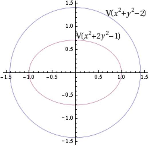 | Keywords: Disjoint ellipses.png en A diagram showing two curves a small ellipse and a larger circle which do not intersect de Ein Diagramm was zwei Kurven zeigt eine kleinere Ellipse und einen größeren Kreis die sich nicht schneiden own Pmidden 2009-11-02 Mathematica command used <nowiki>ContourPlot x 2 + y 2 - 2 0 x 2 + 2 y 2 - 1 0 x -1 5 1 5 y -1 5 1 5 Axes -> True Frame -> False ImageSize -> 250 Epilog -> Text Style V x 2+y 2-2 FontSize -> 14 1 1 1 3 Text Style V x 2+2y 2-1 FontSize -> 14 0 5 0 8 </nowiki> Ellipses Images with Mathematica source code |