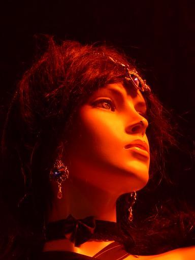 Keywords: display dummy woman doll head face fashion decoration portät jewellery diadem earrings