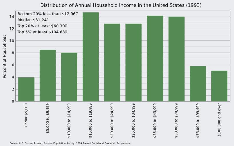 Keywords: Distribution of Annual Household Income in the United States 1993.svg en Distribution of Annual Household Income in the United States in 1993 Based on US Census/Bureau of Labor Statistics data from the https //www census gov/hhes/www/income/data/incpovhlth/1993/index html Income and Poverty Statistics 1993 2016-03-14 own Delphi234 other versions cc-zero Income distribution in the United States |