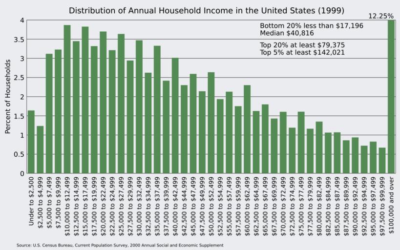 Keywords: Distribution of Annual Household Income in the United States 1999.svg en Distribution of Annual Household Income in the United States in 1999 Based on US Census/Bureau of Labor Statistics data from the https //www census gov/hhes/www/income/data/incpovhlth/1999/index html Money Income in the United States 1999 2016-03-14 own Delphi234 other versions cc-zero Income distribution in the United States |