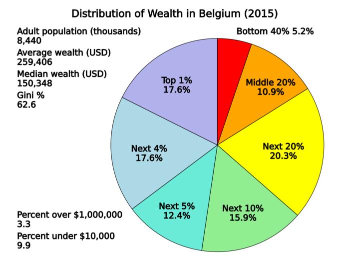 Keywords: Distribution of Wealth in Belgium.svg translate yes en Wealth shares of different percentile groups in Belgium in 2015 Data from Credit Suisse http //publications credit-suisse com/tasks/render/file/index cfm fileid C26E3824-E868-56E0-CCA04D4BB9B9ADD5 Table 6-5 Page 149 2016-07-20 own Delphi234 other versions cc-zero Distribution of wealth Economic inequality SVG pie charts |